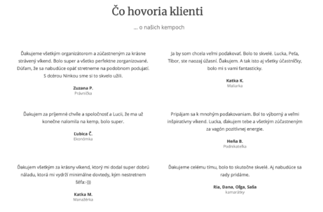 Spolu s Tibim sme v jednej chvíli začali cítiť, že chceme ľuďom nielen pomáhať, ale že sa chceme pri tom aj zabávať a aby sa s nami zabávali aj naši klienti. Preto už niekoľko rokov organizujeme športové kempy, kde spájame príjemné s užitočným. A k tomu sa všetko deje na krásnych miestach... Našou najväčšou odmenou sú spokojní klienti, ktorí okrem aktívneho víkendu zažijú aj skvelý relax a k svojim rodinám sa vracajú usmiati a dobre oddýchnutí.